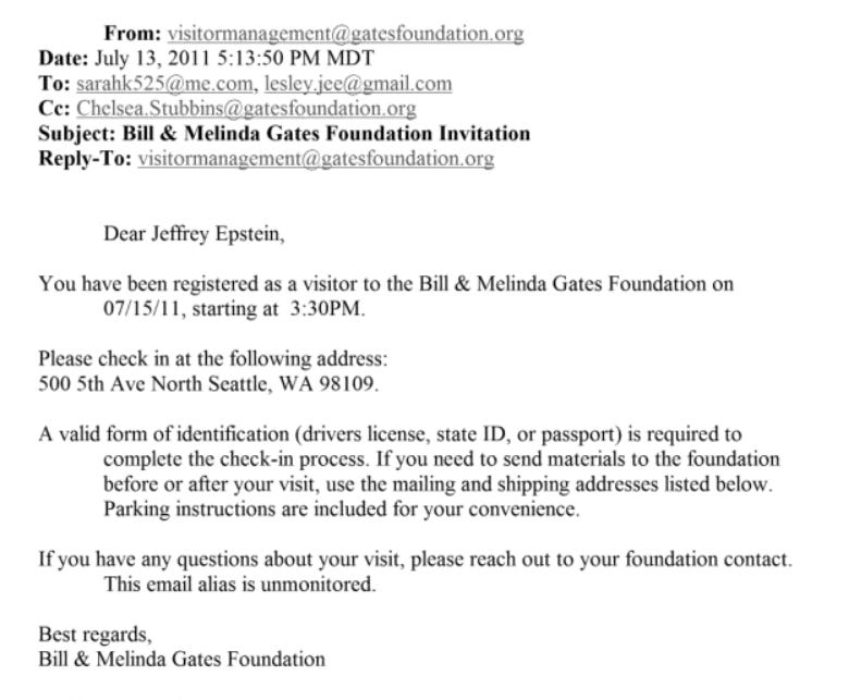 Documents also show that Epstein was scheduled to visit the Gates Foundation’s headquarters in Seattle in 2011. Not long before Epstein’s scheduled visit, The Daily Beast profiled how Epstein “escaped a hefty jail sentence despite overwhelming evidence of sex crimes with dozens of young girls”—part and parcel of the high-profile news coverage that continued to draw attention to Epstein’s predatory behavior.