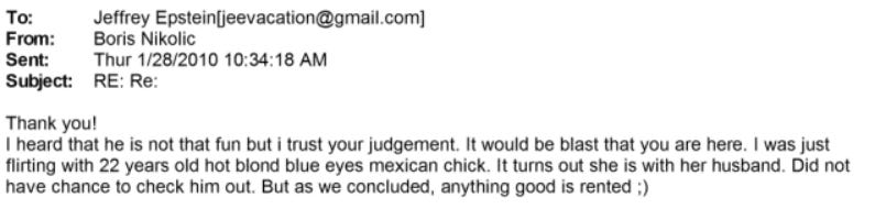 A search of the Epstein Files also shows that Bill Gates’s one-time right-hand man, Boris Nikolic—a former employee of the Gates Foundation, and a key intermediary between Gates and Epstein—appears in 14,536 documents. Nikolic’s correspondence with Epstein is at times personal in nature, including (below) one casual discussion of a young “hot blue eyes mexican chick.”