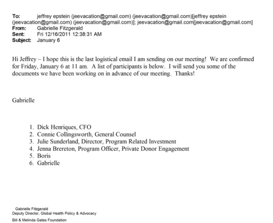 Numerous high-ranking Gates Foundation staff were in direct contact with Epstein, including former chief financial officer Richard Henriques, former foundation legal counsel Connie Collingsworth, former deputy director of the foundation’s global health work, Gabrielle Fitzgerald, and Bill Gates, himself. If foundation staff had any reservations about working with the registered sex offender, the enthusiastic exclamation points in the message below do not convey this.